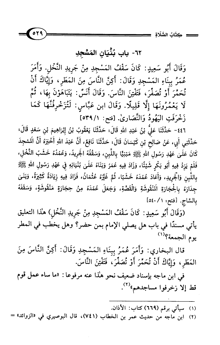 وَقَالَ أَبُو سَعِيدٍ: كَانَ سَقْفُ المَسْجِدِ مِنْ جَرِيدِ النَّخْلِ. وَأَمَرَ عُمَرُ بِبنَاءِ المَسْجِدِ وَقَالَ: أَكِنَّ النَّاسَ مِنَ المَطَرِ، وَإِيَّاكَ أَنْ تُحَمِّرَ أَوْ تُصَفِّرَ، فَتَفْتِنَ النَّاسَ. وَقَالَ أَنَسٌ: يَتَبَاهَوْنَ بِهَا، ثُمَّ لَا يَعْمُرُونَهَا إِلَّا قَلِيلًا. وَقَالَ ابن عَبَّاسٍ: لَتُزَخْرِفُنَّهَا كَمَا زَخْرَفَتِ اليَهُودُ وَالنَّصَارى. [فتح: 1/ 539]