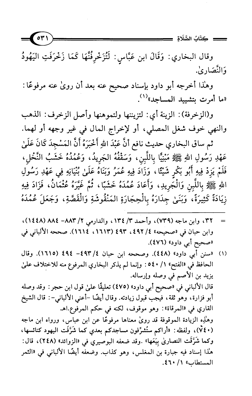 وهذِه الزيادة الموقوفة قد روى معناها مرفوعًا عن ابن عباس، ورواه ابن ماجه (740)، ولفظه: "أراكم ستُشرِّفون مساجدكم بعدي كما شَرَّفَت اليهود كنائسها، وكما شَرَّقَت النصارى بِيَعَها". وقد ضعفه البوصيري في "الزوائد" (248)، قال: هذا إسناد فيه جبارة بن المغلس، وهو كذاب. وضعفه أيضًا الألباني في "الثمر المستطاب" 1/ 460.