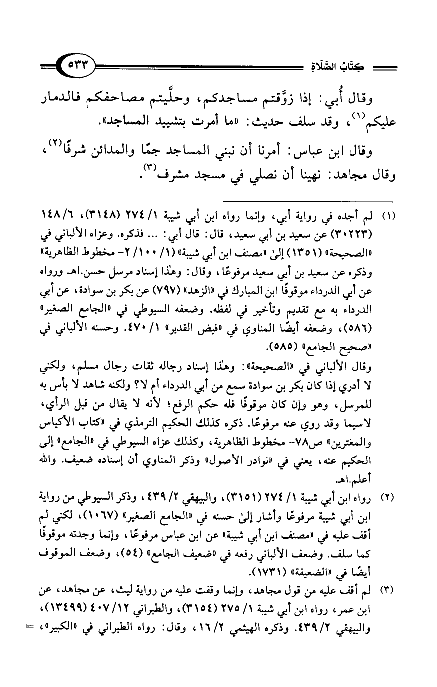 (¬2) رواه ابن أبي شيبة 1/ 274 (3151)، والبيهقي 2/ 439، وذكر السيوطي من رواية ابن أبي شيبة مرفوعًا وأشار إلى حسنه في "الجامع الصغير" (1067)، لكني لم أقف عليه في "مصنف ابن أبي شيبة" عن ابن عباس مرفوعًا، وإنما وجدته موقوفًا كما سلف. وضعف الألباني رفعه في "ضعيف الجامع" (54)، وضعف الموقوف أيضًا في "الضعيفة" (1731).