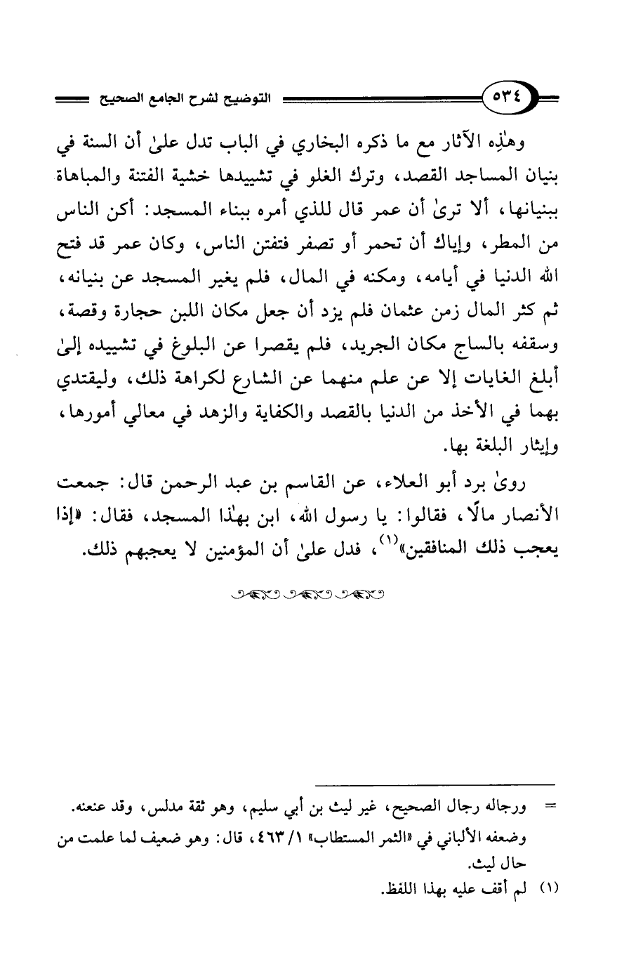وهذِه الآثار مع ما ذكره البخاري في الباب تدل على أن السنة في بنيان المساجد القصد، وترك الغلو في تشييدها خشية الفتنة والمباهاة ببنيانها، ألا ترى أن عمر قال للذي أمره ببناء المسجد: أكن الناس من المطر، وإياك أن تحمر أو تصفر فتفتن الناس، وكان عمر قد فتح الله الدنيا في أيامه، ومكنه في المال، فلم يغير المسجد عن بنيانه، ثم كثر المال زمن عثمان فلم يزد أن جعل مكان اللبن حجارة وقصة، وسقفه بالساج مكان الجريد، فلم يقصرا عن البلوغ في تشييده إلى أبلغ الغايات إلا عن علم منهما عن الشارع لكراهة ذلك، وليقتدي بهما في الأخذ من الدنيا بالقصد والكفاية والزهد في معالي أمورها، وإيثار البلغة بها.