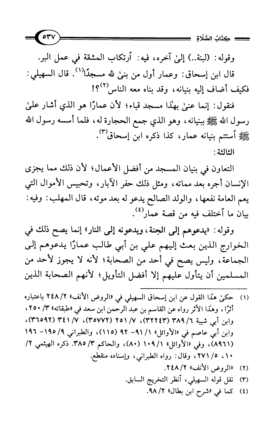 التعاون في بنيان المسجد من أفضل الأعمال؛ لأن ذلك مما يجزى الإنسان أجره بعد مماته، ومثل ذلك حفر الآبار، وتحبيس الأموال التي يعم العامة نفعها، والولد الصالح يدعو له بعد موته، قال المهلب: وفيه: بيان ما اختلف فيه من قصة عمار (¬4).