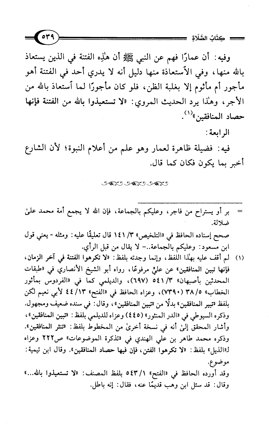 وفيه: أن عمارًا فهم عن النبي - صلى الله عليه وسلم - أن هذِه الفتنة في الذين يستعاذ بالله منها، وفي الاستعاذة منها دليل أنه لا يدري أحد في الفتنة أهو مأجور أم مأثوم إلا بغلبة الظن، فلو كان مأجورًا لما استعاذ بالله من الأجر، وهذا يرد الحديث المروي: "لا تستعيذوا بالله من الفتنة فإنها حصاد المنافقين" (¬1).