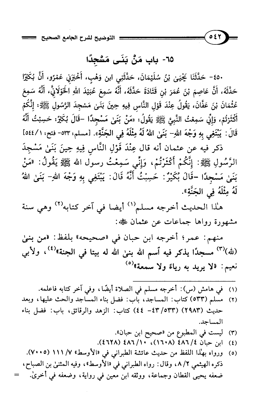450 - حَدَّثَنَا يَحْيَى بْنُ سُلَيْمَانَ، حَدَّثَنِي ابن وَهْبٍ، أَخْبَرَنِي عَمْرٌو، أَنَّ بُكَيْرًا حَدَّثَهُ، أَنَّ عَاصِمَ بْنَ عُمَرَ بْنِ قَتَادَةَ حَدَّثَهُ، أَنَّهُ سَمِعَ عُبَيْدَ اللهِ الَخوْلَانِيَّ، أَنَّهُ سَمِعَ عُثْمَانَ بْنَ عَفَّانَ، يَقُولُ عِنْدَ قَوْلِ النَّاسِ فِيهِ حِينَ بَنَى مَسْجِدَ الرَّسُولِ - صلى الله عليه وسلم -: إِنَّكُمْ أَكْثَرْتُمْ، وِإِنِّي سَمِعْتُ النَّبِيَّ - صلى الله عليه وسلم - يَقُولُ: "مَنْ بَنَى مَسْجِدًا -قَالَ بُكَيْرٌ: حَسِبْتُ أَنَّهُ قَالَ: يَبْتَغِي بِهِ وَجْهَ اللهِ- بَنَى اللهُ لَهُ مِثْلَهُ فِي الجَنَّةِ". [مسلم: 533 - فتع: 1/ 544]