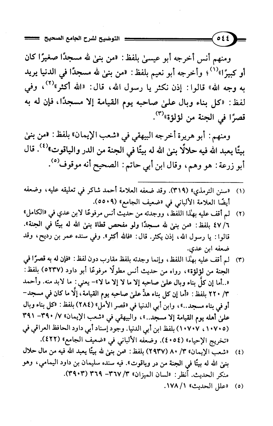 (¬4) "شعب الإيمان" 3/ 80 (2937) بلفظ: "من بنى لله بيتًا يعبد الله فيه من مال حلال بنى الله له بيتًا في الجنة من در وياقوت". فيه سنده سليمان بن داود اليمامي، وهو منكر الحديث. انظر: "لسان الميزان" 3/ 367 - 369 (3903).
