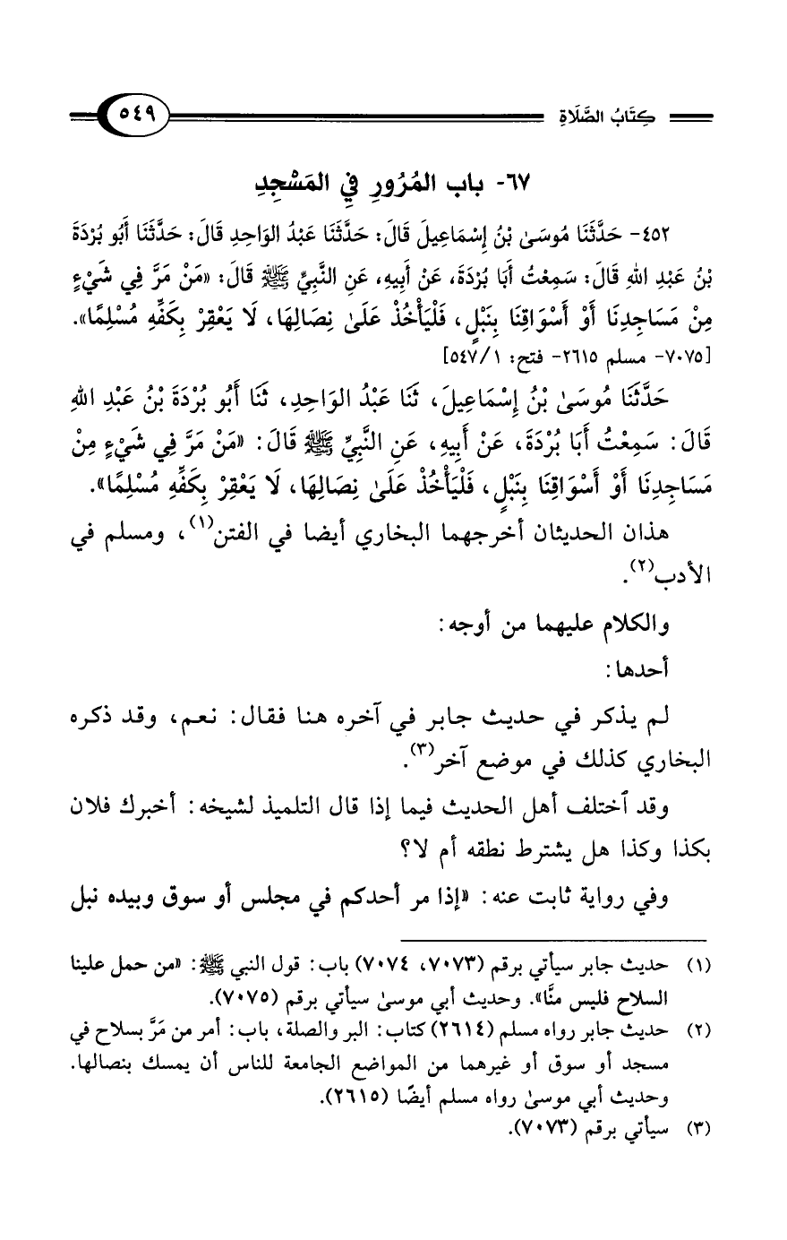 452 - حَدَّثَنَا مُوسَى بْنُ إِسْمَاعِيلَ قَالَ: حَدَّثَنَا عَبْدُ الوَاحِدِ قَالَ: حَدَّثَنَا أَبُو بُرْدَةَ بْنُ عَبْدِ اللهِ قَالَ: سَمِعْتُ أَبَا بُرْدَةَ، عَنْ أَبِيهِ، عَنِ النَّبِيِّ - صلى الله عليه وسلم - قَالَ: "مَنْ مَرَّ فِي شَيْءٍ مِنْ مَسَاجِدِنَا أَوْ أَسْوَاقِنَا بِنَبْلٍ، فَلْيَأْخُذْ عَلَى نِصَالِهَا، لَا يَعْقِرْ بِكَفِّهِ مُسْلِمًا". [7075 - مسلم 2615 - فتح: 1/ 547]