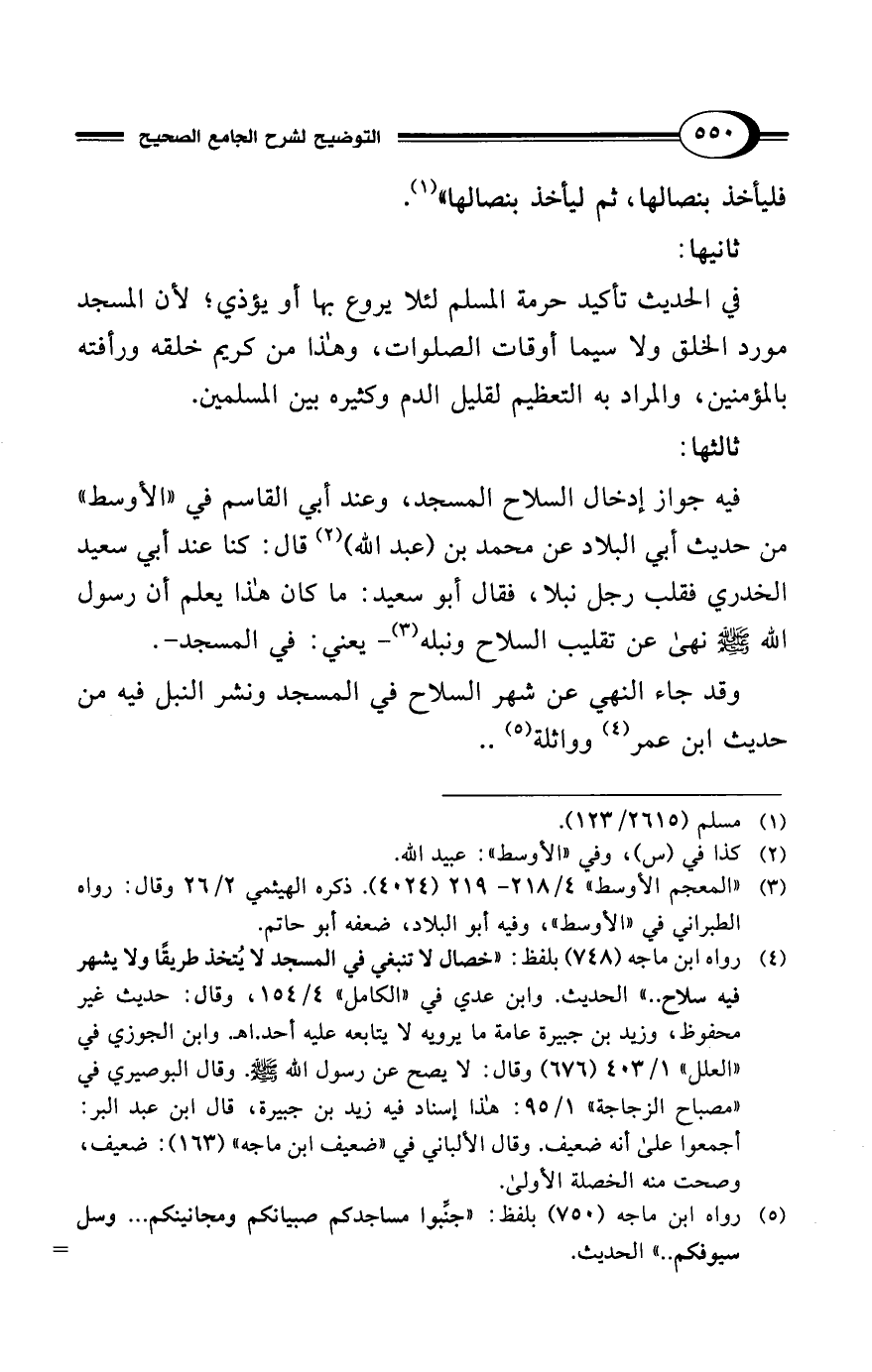 (¬4) رواه ابن ماجه (748) بلفظ: "خصال لا تنبغي في المسجد لا يُتخذ طريقًا ولا يشهر فيه سلاح .. " الحديث. وابن عدي في "الكامل" 4/ 154، وقال: حديث غير محفوظ، وزيد بن جبيرة عامة ما يرويه لا يتابعه عليه أحد. اهـ. وابن الجوزي في "العلل" 1/ 403 (676) وقال: لا يصح عن رسول الله - صلى الله عليه وسلم -. وقال البوصيري في "مصباح الزجاجة" 1/ 95: هذا إسناد فيه زيد بن جبيرة، قال ابن عبد البر: أجمعوا على أنه ضعيف. وقال الألباني في "ضعيف ابن ماجه" (163): ضعيف، وصحت منه الخصلة الأولى.