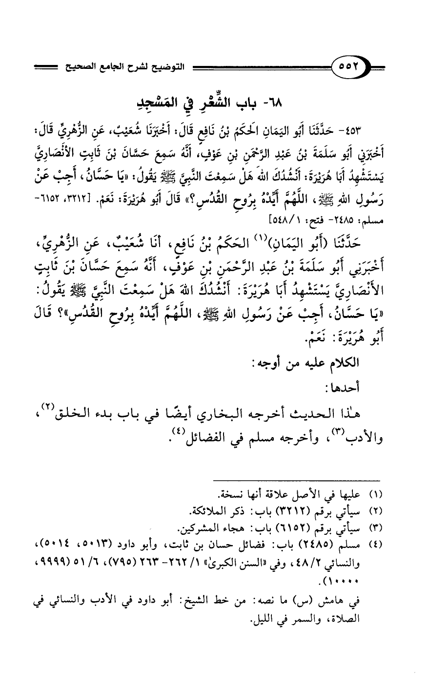453 - حَدَّثَنَا أَبُو اليَمَانِ الَحكَمُ بْنُ نَافِع قَالَ: أَخْبَرَنَا شعَيْبٌ، عَنِ الزُّهْرِيِّ قَالَ: أَخْبَرَنِي أَبُو سَلَمَةَ بن عَبْدِ الرَّحْمَنِ بْنِ عَوْفٍ، أَنَّة سَمِعَ حَسَّانَ بْنَ ثَابِتِ الأنصَارِيَّ يَسْتَشْهِدُ أَبَا هُرَيْرَةَ: أَنْشُدُكَ اللهَ هَلْ سَمِعْتَ النَّبِيَّ - صلى الله عليه وسلم - يَقُولُ: "يَا حَسَّانُ، أَجِبْ عَنْ رَسُولِ اللهِ - صلى الله عليه وسلم -، اللَّهُمَّ أَيِّدْهُ بِرُوحِ القُدُسِ؟ " قَالَ أَبُو هُرَيْرَةَ: نَعَمْ. [3212، 6152 - مسلم: 2485 - فتح: 1/ 548]