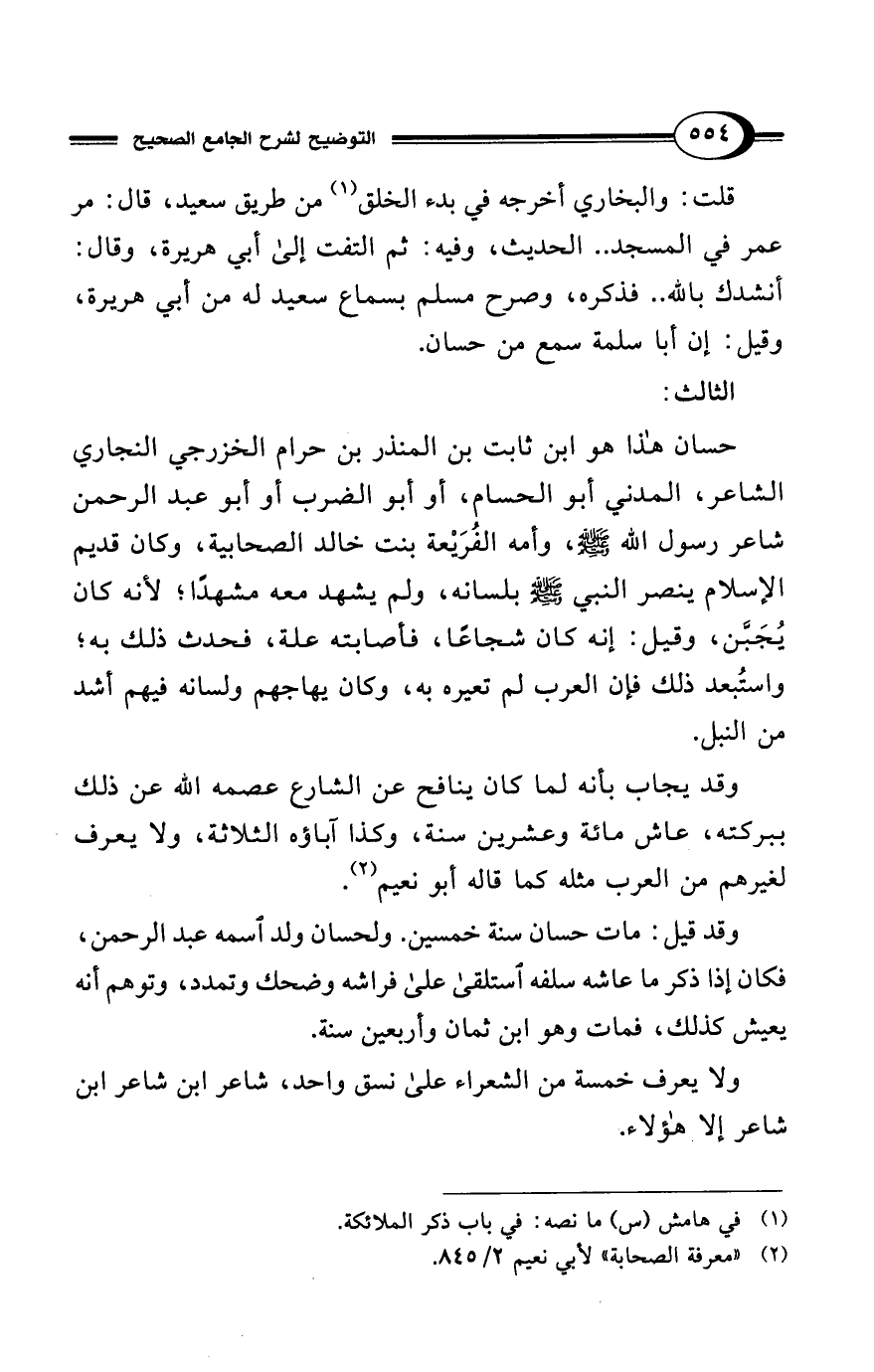 قلت: والبخاري أخرجه في بدء الخلق (¬1) من طريق سعيد، قال: مر عمر في المسجد .. الحديث، وفيه: ثم التفت إلى أبي هريرة، وقال: أنشدك بالله .. فذكره، وصرح مسلم بسماع سعيد له من أبي هريرة، وقيل: إن أبا سلمة سمع من حسان.