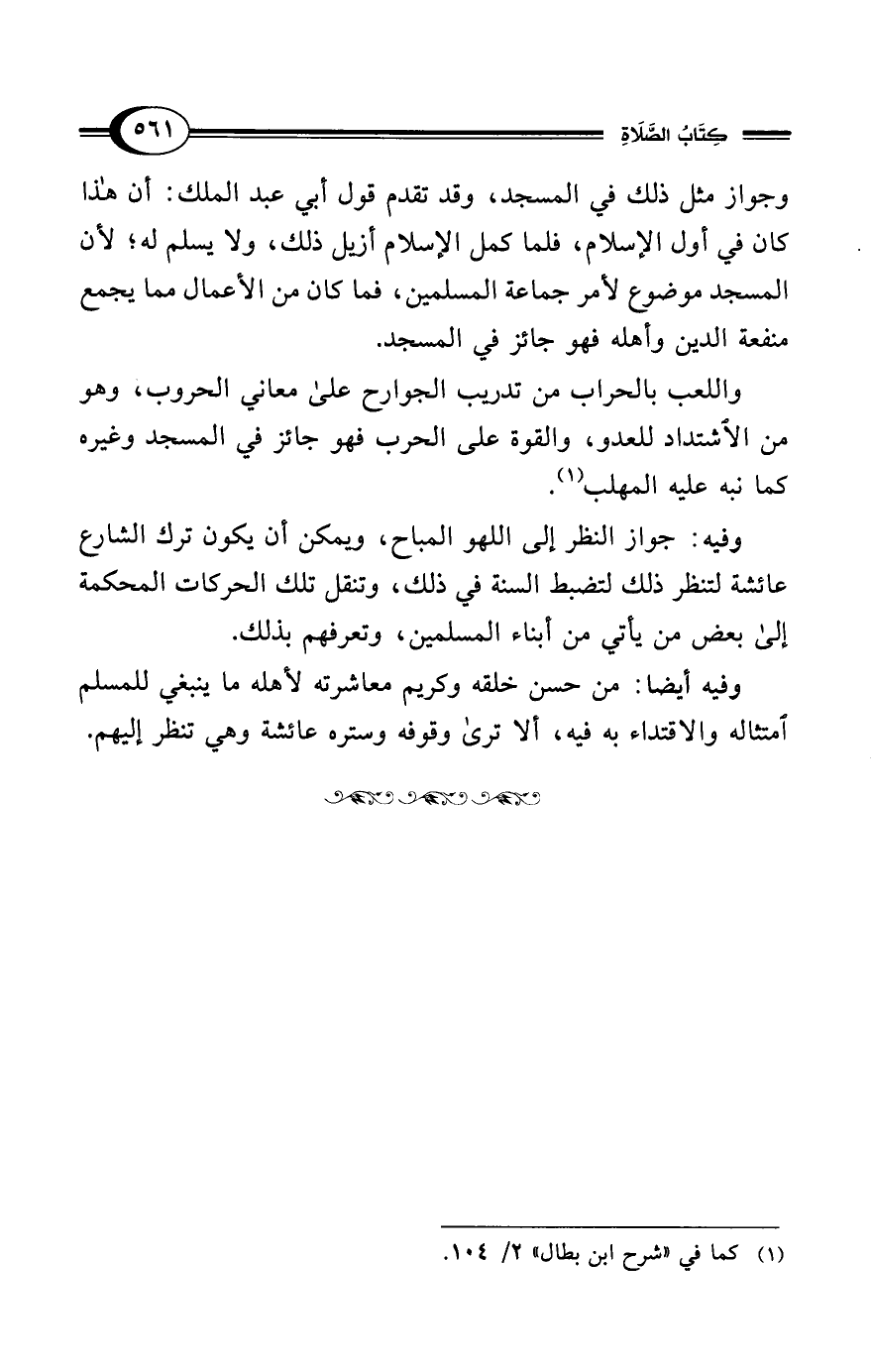 واللعب بالحراب من تدريب الجوارح على معاني الحروب، وهو من الاشتداد للعدو، والقوة على الحرب فهو جائز في المسجد وغيره كما نبه عليه المهلب (¬1).