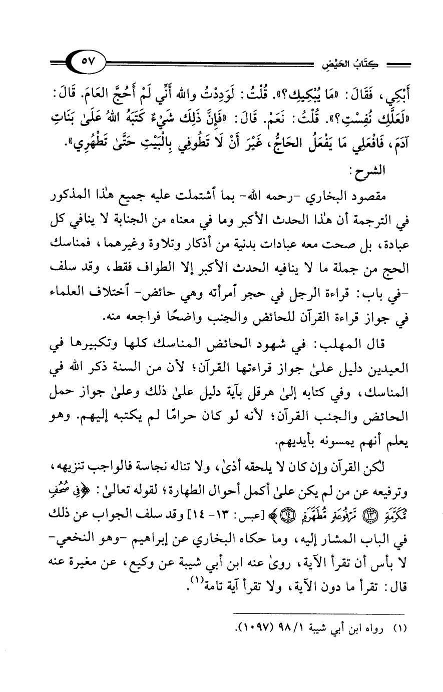 أَبْكِي، فَقَالَ: "مَا يُبْكِيكِ؟ ". قُلْتُ: لَوَدِدْتُ والله أَنِّي لَمْ أَحُجَّ العَامَ. قَالَ: "لَعَلَّكِ نُفِسْتِ؟ ". قُلْتُ: نَعَمْ. قَالَ: "فَإِنَّ ذَلِكَ شَيْءٌ كتَبَهُ اللهُ على بَنَاتِ آدَمَ، فَافْعَلِي مَا يَفْعَلُ الحَاجُّ، غَيْرَ أَنْ لَا تَطُوفِي بِالْبَيْتِ حَتَّى تَطْهُرِي".