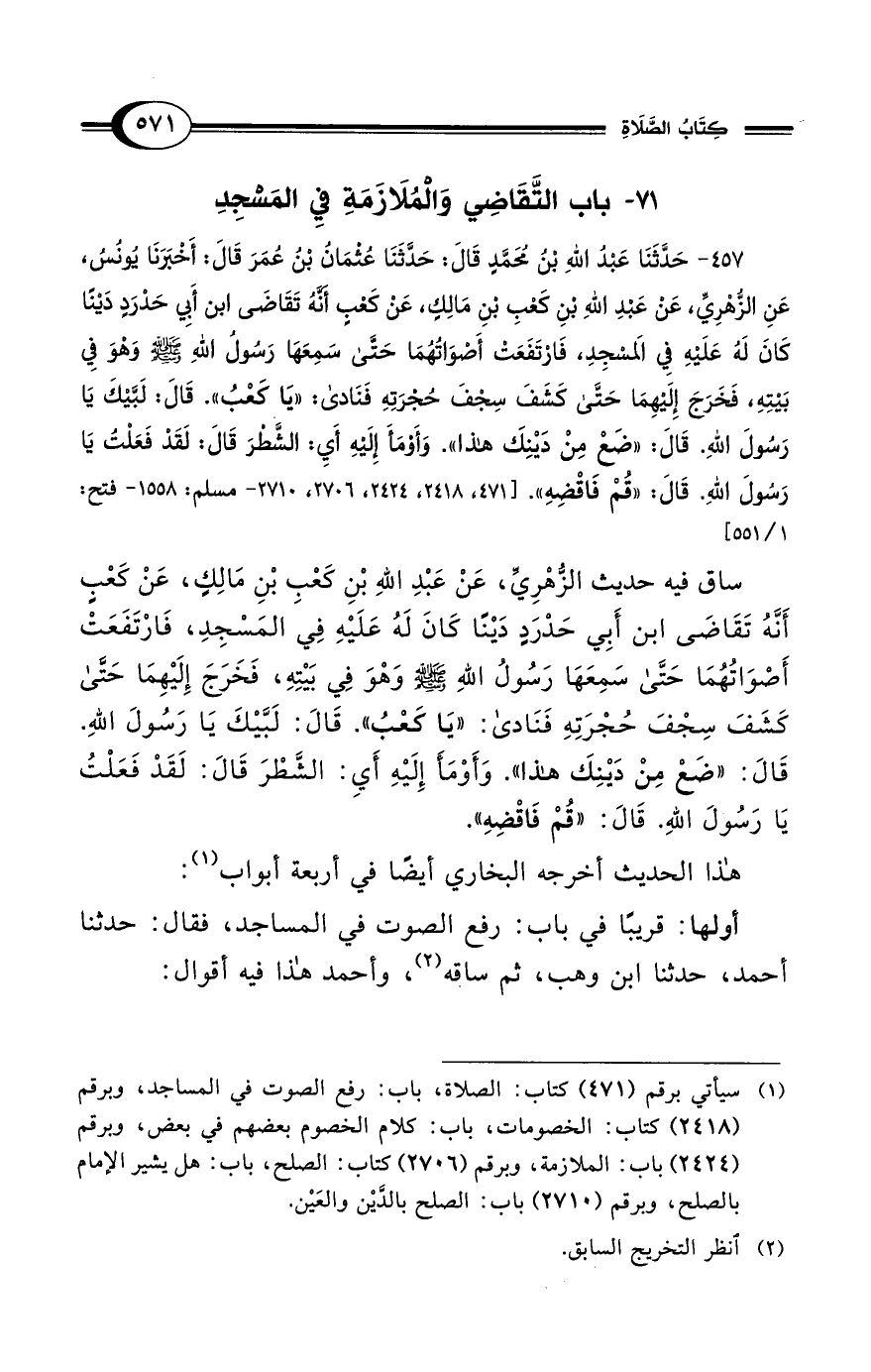 457 - حَدَّثَنَا عَبْدُ اللهِ بْنُ مُحَمَّدٍ قَالَ: حَدَّثَنَا عُثْمَانُ بْنُ عُمَرَ قَالَ: أَخْبَرَنَا يُونُسُ، عَنِ الزُّهْرِيِّ، عَنْ عَبْدِ اللهِ بْنِ كَعْبِ بْنِ مَالِكٍ، عَنْ كَعْبٍ أَنَّهُ تَقَاضَى ابن أَبِي حَدْرَدٍ دَيْنًا كَانَ لَهُ عَلَيْهِ فِي الَمسْجِدِ، فَارْتَفَعَتْ أَصْوَاتُهُمَا حَتَّى سَمِعَهَا رَسُول اللهِ - صلى الله عليه وسلم - وَهْوَ فِي بَيْتِهِ، فَخَرَجَ إِلَيْهِمَا حَتَّى كَشَفَ سِجْفَ حُجْرَتِهِ فَنَادى: "يَا كَعْبُ". قَالَ: لَبَّيْكَ يَا رَسُولَ اللهِ. قَالَ: "ضَعْ مِنْ دَيْنِكَ هذا". وَأَوْمَأَ إِلَيْهِ أَيِ: الشَّطرَ قَالَ: لَقَدْ فَعَلْتُ يَا رَسُولَ اللهِ. قَالَ: "قُمْ فَاقْضِهِ". [471، 2418، 2424، 2706، 2710 - مسلم: 1558 - فتح: 1/ 551]