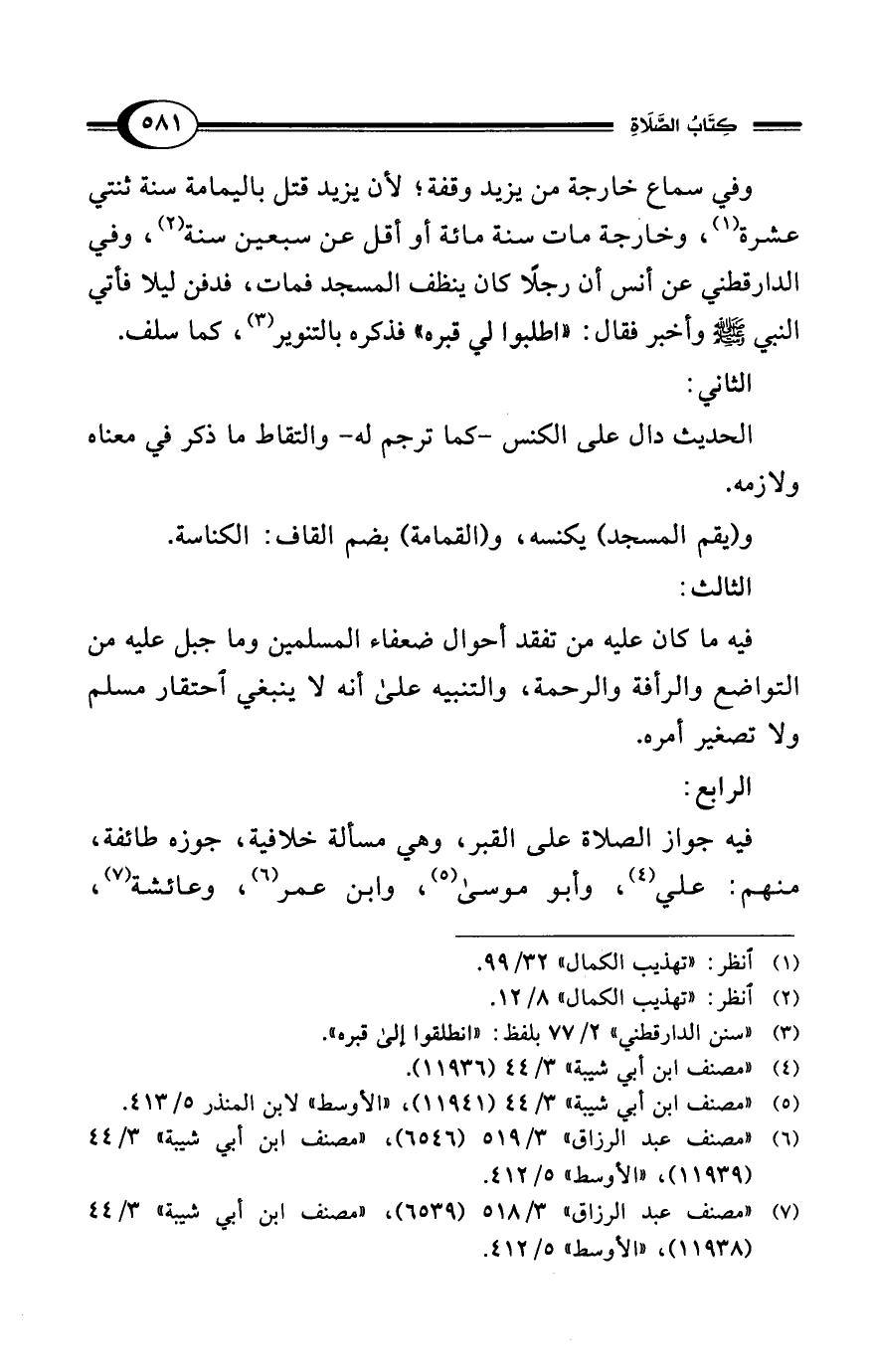 وفي سماع خارجة من يزيد وقفة؛ لأن يزيد قتل باليمامة سنة ثنتي عشرة (¬1)، وخارجة مات سنة مائة أو أقل عن سبعين سنة (¬2)، وفي الدارقطني عن أنس أن رجلًا كان ينظف المسجد فمات، فدفن ليلا فأتي النبي - صلى الله عليه وسلم - وأخبر فقال: "اطلبوا لي قبره" فذكره بالتنوير (¬3)، كما سلف.
