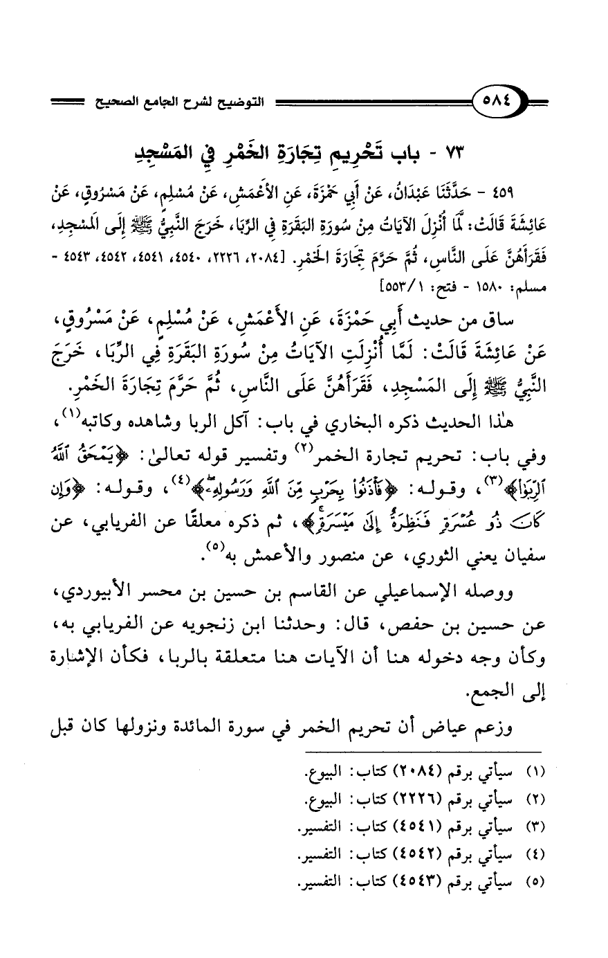 459 - حَدَّثَنَا عَبْدَانُ، عَنْ أَبِي حَمْزَةَ، عَنِ الأعمَشِ، عَنْ مُسْلِمِ، عَنْ مَسْرُوقٍ، عَنْ عَائِشَةَ قَالَتْ: لَمَّا أُنْزِلَ الآيَاتُ مِنْ سُورَةِ البَقَرَةِ فِي الرِّبَا، خَرَجَ النَّبِيُّ - صلى الله عليه وسلم - إِلَى الَمسْجِدِ، فَقَرَأَهُنَّ عَلَى النَّاسِ، ثُمَّ حَرَّمَ تِجَارَةَ الَخمْرِ. [2084، 2226، 4540، 4541، 4542، 4543 - مسلم: 1580 - فتح: 1/ 553]