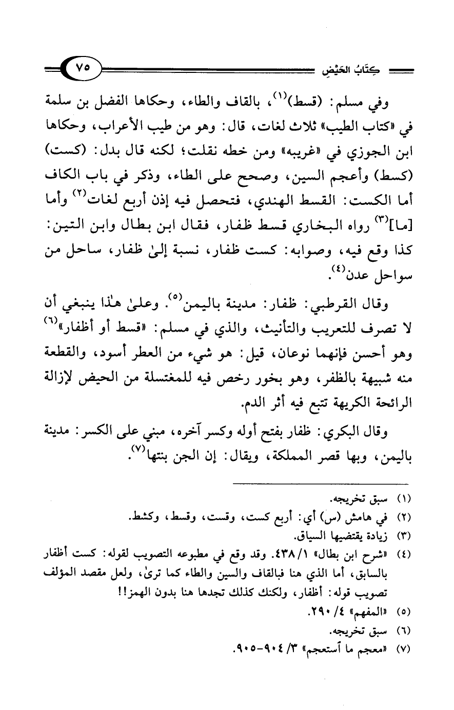 وقال القرطبي: ظفار: مدينة باليمن (¬5). وعلى هذا ينبغي أن لا تصرف للتعريب والتأنيث، والذي في مسلم: "قسط أو أظفار" (¬6) وهو أحسن فإنهما نوعان، قيل: هو شيء من العطر أسود، والقطعة منه شبيهة بالظفر، وهو بخور رخص فيه للمغتسلة من الحيض لإزالة الرائحة الكريهة تتبع فيه أثر الدم.