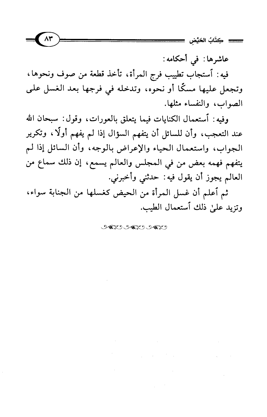 ثم اعلم أن غسل المرأة من الحيض كغسلها من الجنابة سواء، وتزيد على ذلك استعمال الطيب.