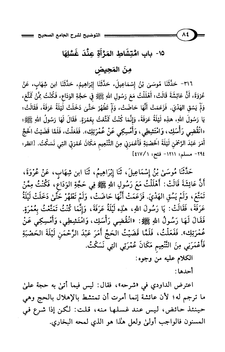 316 - حَدَّثَنَا مُوسَى بْنُ إِسْمَاعِيلَ، حَدَّثَنَا إِبْرَاهِيمُ، حَدَّثَنَا ابن شِهَابٍ، عَنْ عُرْوَةَ، أَنَّ عَائِشَةَ قَالَتْ: أَهْلَلْتُ مَعَ رَسُولِ اللهِ - صلى الله عليه وسلم - فِي حَجَّةِ الوَدَاعِ، فَكُنْتُ مِمَّن تَمَتَّعَ، وَلَمْ يَسُقِ الهَدْيَ. فَزَعَمَتْ أَنَّهَا حَاضَتْ، وَلَمْ تَطْهُرْ حَتَّى دَخَلَتْ لَيْلَةُ عَرَفَةَ، فَقَالَتْ: يَا رَسُولَ اللهِ، هذِه لَيْلَةُ عَرَفَةَ، وإِنَّمَا كنْتُ تَمَتَّعْتُ بِعُمْرةٍ. فَقَالَ لَهَا رسول اللهِ - صلى الله عليه وسلم -: "انْقُضِي رَأْسَكِ، وَامْتَشِطِي، وَأَمْسِكِي عَنْ عُمْرَتِكِ". فَفَعَلْتُ، فَلَمَّا قَضَيْتُ الَحجَّ أَمَرَ عَبْدَ الرَّحْمَنِ لَيْلَةَ الَحصْبَةِ فَأَعْمَرَنِي مِنَ التَّنْعِيمِ مَكَانَ عُمْرَتِي التِي نَسَكْتُ. [انظر: 294 - مسلم:1211 - فتح: 1/ 417]