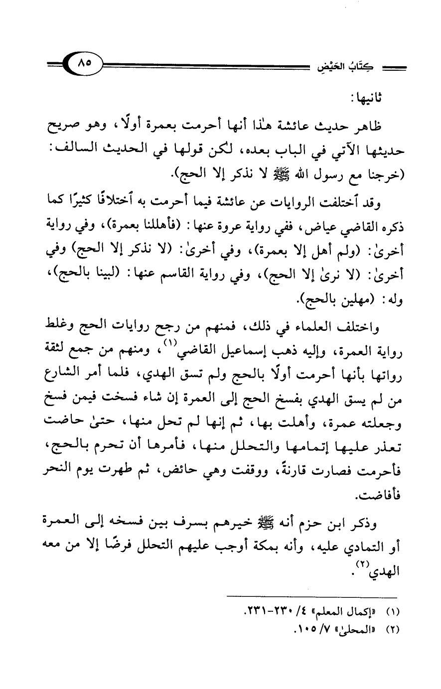 واختلف العلماء في ذلك، فمنهم من رجح روايات الحج وغلط رواية العمرة، وإليه ذهب إسماعيل القاضي (¬1)، ومنهم من جمع لثقة رواتها بأنها أحرمت أولًا بالحج ولم تسق الهدي، فلما أمر الشارع من لم يسق الهدي بفسخ الحج إلى العمرة إن شاء فسخت فيمن فسخ وجعلته عمرة، وأهلت بها، ثم إنها لم تحل منها، حتى حاضت تعذر عليها إتمامها والتحلل منها، فأمرها أن تحرم بالحج، فأحرمت فصارت قارنةً، ووقفت وهي حائض، ثم طهرت يوم النحر فأفاضت.