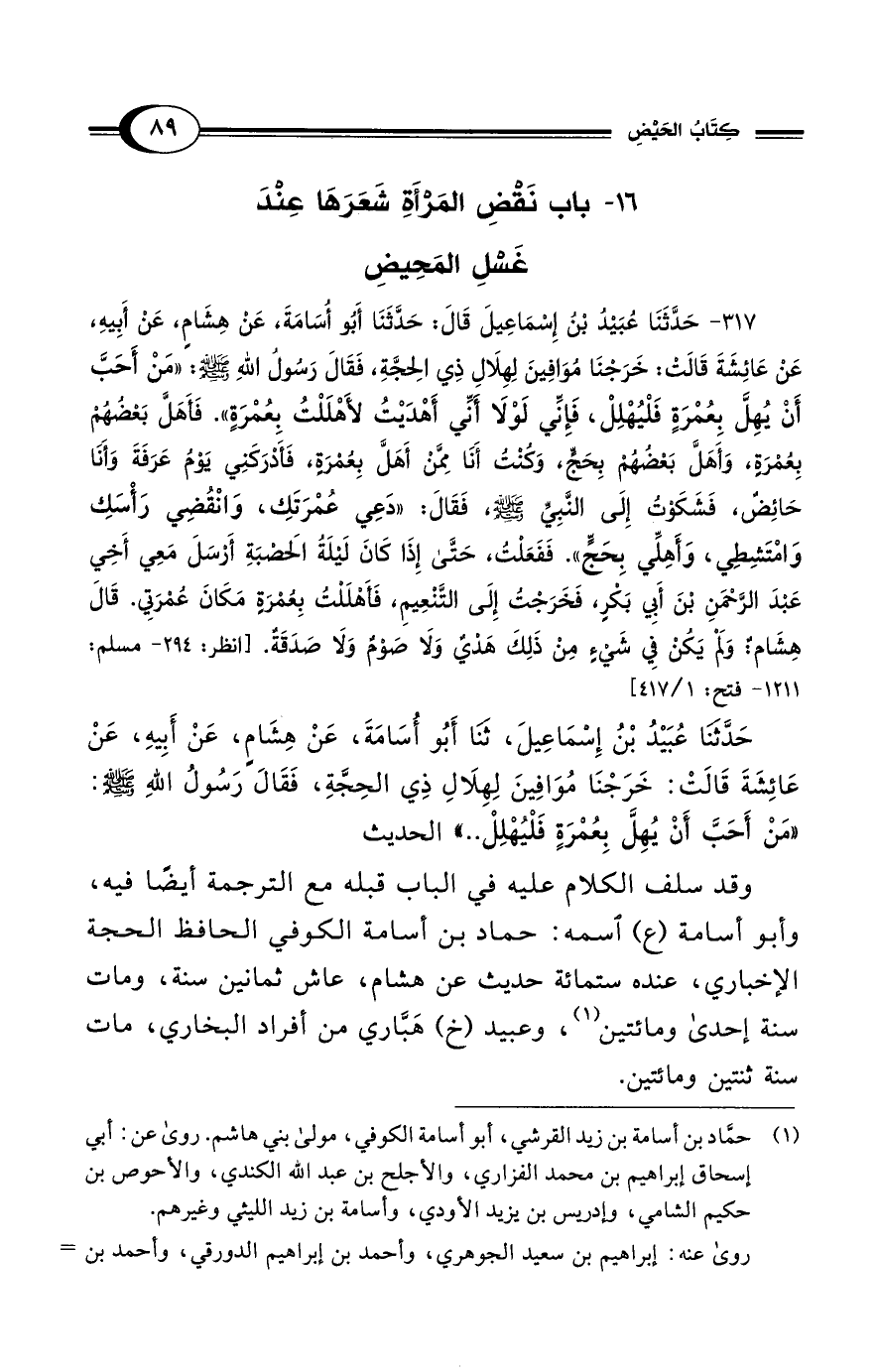 317 - حَدَّثَنَا عُبَيْدُ بْنُ إِسْمَاعِيلَ قَالَ: حَدَّثَنَا أَبُو أُسَامَةَ، عَنْ هِشَامِ، عَنْ أَبِيهِ، عَنْ عَائِشَةَ قَالَت: خَرَجْنَا مُوَافِينَ لِهِلَالِ ذِي الِحجَّةِ، فَقَالَ رَسُولُ اللهِ - صلى الله عليه وسلم -: "مَنْ أَحَبَّ أَنْ يُهِلَّ بِعُمْرَةٍ فَلْيُهْلِلْ، فَإِنِّي لَوْلَا أَنِّي أَهْدَيْتُ لأَهْلَلْتُ بِعُمْرَةٍ". فَأَهَلَّ بَعْضُهُمْ بِعُمْرَةٍ، وَأَهَلَّ بَعْضُهُمْ بِحَجٍّ، وَكُنْتُ أَنَا مِمَّنْ أَهَلَّ بِعُمْرَةٍ". فَأَدْرَكَنِي يَوْمُ عَرَفَةَ وَأَنَا حَائِضٌ، فَشَكَوْتُ إِلَى النَّبِىِّ - صلى الله عليه وسلم -، فَقَالَ: "دَعِي عُمْرَتَكِ، وَانْقُضِي رَأْسَكِ وَامْتَشِطِي، وَأَهِلِّي بِحَجٍّ". فَفَعَلْتُ، حَتَّى إِذَا كَانَ لَيْلَةُ الَحصْبَةِ أَرْسَلَ مَعِي أَخِي عَبْدَ الرَّحْمَنِ بْنَ أَبِي بَكْرٍ، فَخَرَجْتُ إِلَى التَّنْعِيمِ، فَأَهْلَلْتُ بِعُمْرَةِ مَكَانَ عُمْرَتِي. قَالَ هِشَام: وَلَمْ يَكنْ فِي شَيءٍ مِنْ ذَلِكَ هَدْيٌ وَلَا صَوْمٌ وَلَا صَدَقَةٌ. [انظر: 294 - مسلم: 1211 - فتح: 1/ 417]