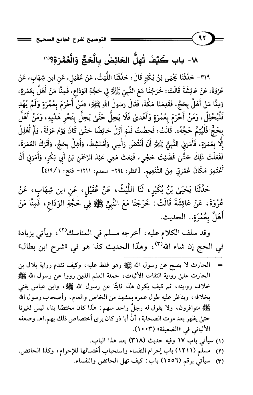 319 - حَدَّثَنَا يَحْيَى بْنُ بُكَيْرٍ قَالَ: حَدَّثَنَا اللَّيْثُ، عَنْ عُقَيْلٍ، عَنِ ابن شِهَابٍ، عَنْ عُرْوَةَ، عَنْ عَائِشَةَ قَالَتْ: خَرَجْنَا مَعَ النَّبِيِّ - صلى الله عليه وسلم - فِي حَجَّةِ الوَدَاعِ، فَمِنَّا مَنْ أَهَلَّ بِعُمْرَةٍ، وَمِنَّا مَنْ أَهَلَّ بِحَجِّ، فَقَدِمْنَا مَكَّةَ، فَقَالَ رَسُولُ اللهِ - صلى الله عليه وسلم -: "مَنْ أَحْرَمَ بِعُمْرَةٍ وَلَمْ يُهْدِ فَلْيُحْلِلْ، وَمَنْ أَحْرَمَ بِعُمْرَةٍ وَأَهْدى فَلَا يَحِلُّ حَتَّى يَحِلَّ بِنَحْرِ هَدْيِهِ، وَمَنْ أَهَلَّ بِحَجٍّ فَلْيُتِمَّ حَجَّهُ". قَالَتْ: فَحِضْتُ فَلَمْ أَزَلْ حَائِضًا حَتَّى كَانَ يَوْمُ عَرَفَةَ، وَلَمْ أُهْلِلْ إِلَّا بِعُمْرَةٍ، فَأَمَرَنِى النَّبِيُّ - صلى الله عليه وسلم - أَنْ أَنْقُضَ رَأْسِي وَأَمْتَشِطَ، وَأُهِلَّ بِحَجٍّ، وَأَتْرُكَ العُمْرَةَ، فَفَعَلْتُ ذَلِكَ حَتَّى قَضَيْتُ حَجِّي، فَبَعَثَ مَعِي عَبْدَ الرَّحْمَنِ بْنَ أبي بَكْرٍ، وَأَمَرَنِى أَنْ أَعْتَمِرَ مَكَانَ عُمْرَتِى مِنَ التَّنْعِيمِ. [انظر: 294 - مسلم: 1211 - فتح: 1/ 419]