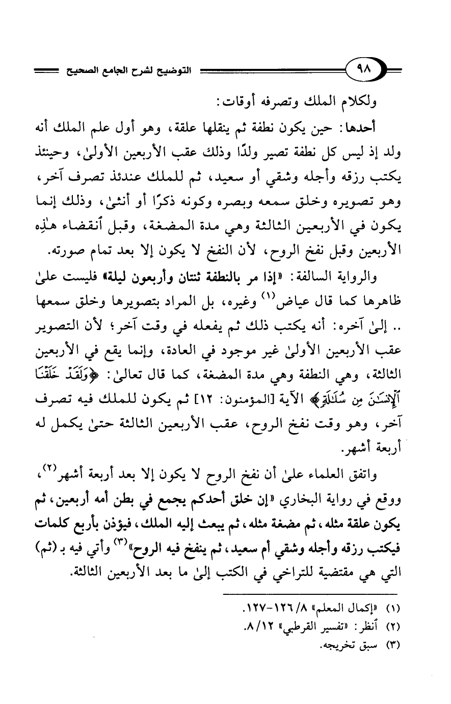 والرواية السالفة: "إذا مر بالنطفة ثنتان وأربعون ليلة" فليست على ظاهرها كما قال عياض (¬1) وغيره، بل المراد بتصويرها وخلق سمعها .. إلى آخره: أنه يكتب ذلك ثم يفعله في وقت آخر؛ لأن التصوير عقب الأربعين الأولى غير موجود في العادة، وإنما يقع في الأربعين الثالثة، وهي النطفة وهي مدة المضغة، كما قال تعالى: {وَلَقَدْ خَلَقْنَا الْإِنْسَانَ مِنْ سُلَالَةٍ} الآية [المؤمنون: 12] ثم يكون للملك فيه تصرف آخر، وهو وقت نفخ الروح، عقب الأربعين الثالثة حتى يكمل له أربعة أشهر.