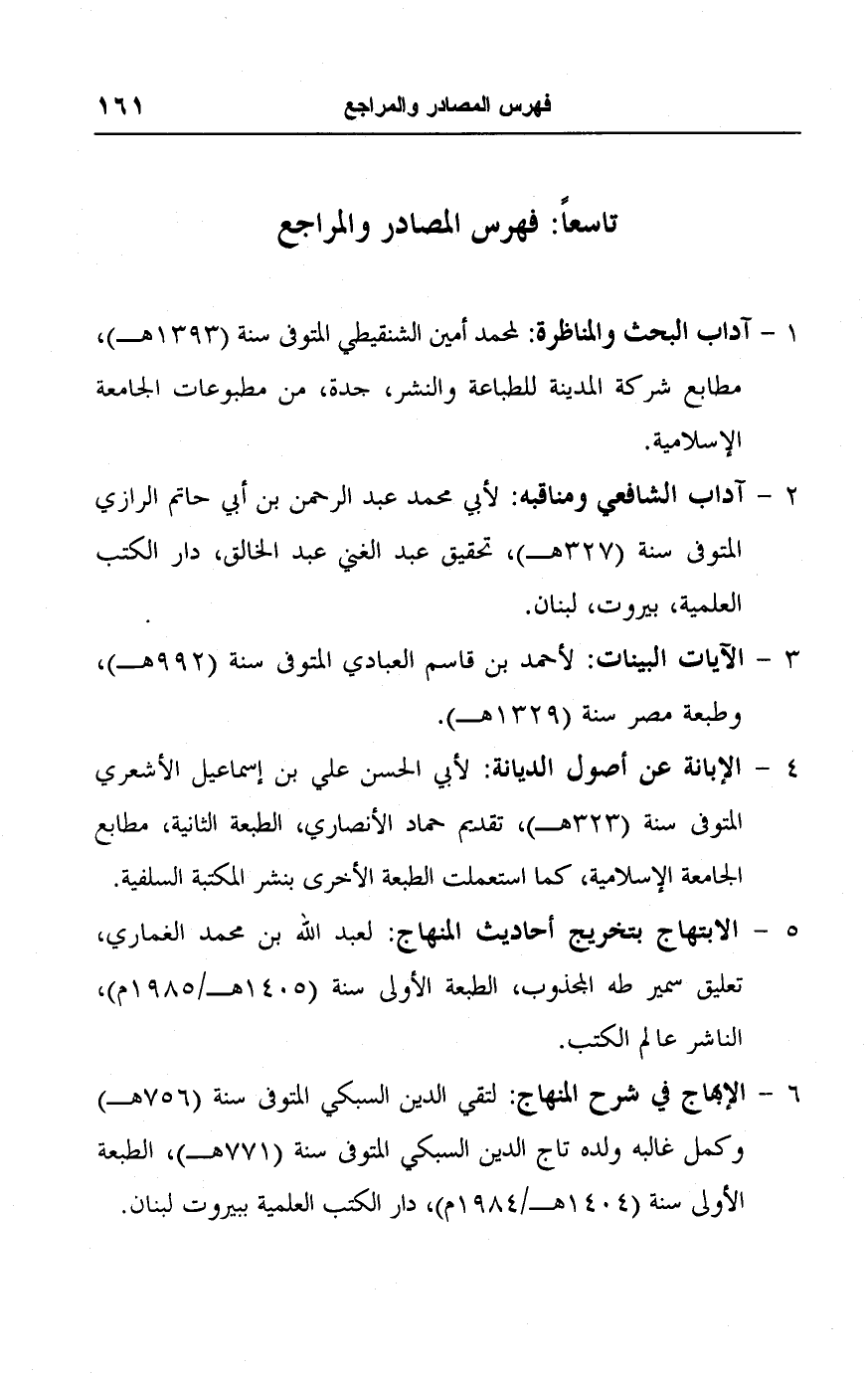 ١ - آداب البحث والمناظرة: لمحمد أمين الشنقيطي المتوفى سنة (١٣٩٣ هـ)، مطابع شركة المدينة للطباعة والنشر، جدة، من مطبوعات الجامعة الإسلامية.
