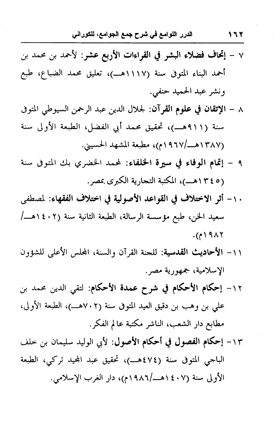 ١٢ - إحكام الأحكام في شرح عمدة الأحكام: لتقي الدين محمد بن علي بن وهب بن دقيق العيد المتوفى سنة (٧٠٢ هـ)، الطبعة الأولى، مطابع دار الشعب، الناشر مكتبة عالم الفكر.