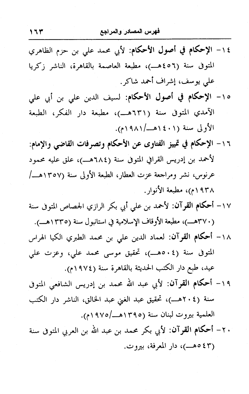 ١٦ - الإحكام في تمييز الفتاوى عن الأحكام وتصرفات القاضي والإمام: لأحمد بن إدريس القرافي المتوفى سنة (٦٨٤ هـ)، علق عليه محمود عرنوس، نشر ومراجعة عزت العطار، الطبعة الأولى سنة (١٣٥٧ هـ/ ١٩٣٨ م)، مطبعة الأنوار.