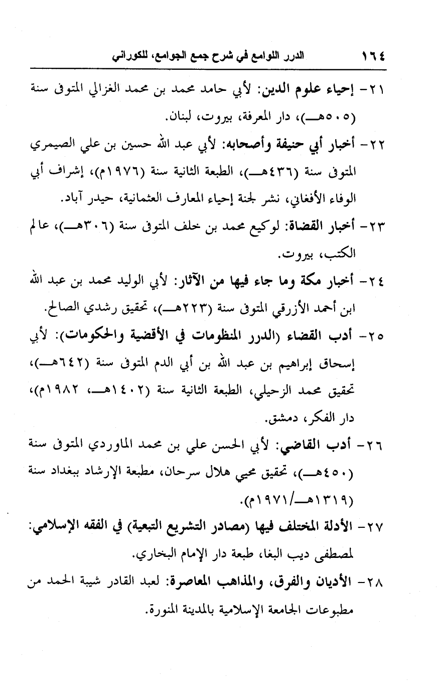 ٢٥ - أدب القضاء (الدرر المنظومات في الأقضية والحكومات): لأبي إسحاق إبراهيم بن عبد اللَّه بن أبي الدم المتوفى سنة (٦٤٢ هـ)، تحقيق محمد الزحيلي، الطبعة الثانية سنة (١٤٠٢ هـ، ١٩٨٢ م)، دار الفكر، دمشق.