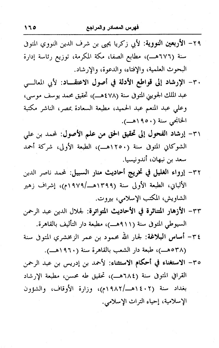 ٣٠ - الإرشاد إلى قواطع الأدلة في أصول الاعتقاد: لأبي المعالي عبد الملك الجويني المتوفى سنة (٤٧٨ هـ)، تحقيق محمد يوسف موسى، وعلي عبد المنعم عبد الحميد، مطبعة السعادة بمصر، الناشر مكتبة الخانجى سنة (١٩٥٠ هـ).