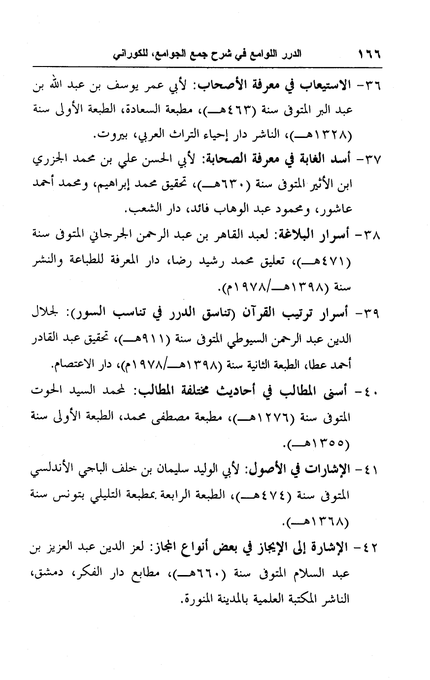 ٣٩ - أسرار ترتيب القرآن (تناسق الدرر في تناسب السور): لجلال الدين عبد الرحمن السيوطي المتوفى سنة (٩١١ هـ)، تحقيق عبد القادر أحمد عطا، الطبعة الثانية سنة (١٣٩٨ هـ/ ١٩٧٨ م)، دار الاعتصام.