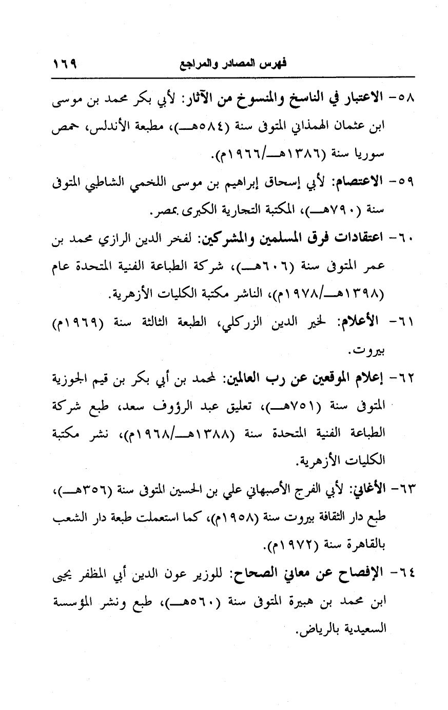 ٥٨ - الاعتبار في الناسخ والمنسوخ من الآثار: لأبي بكر محمد بن موسى ابن عثمان الهمذاني المتوفى سنة (٥٨٤ هـ)، مطبعة الأندلس، حمص سوريا سنة (١٣٨٦ هـ/ ١٩٦٦ م).