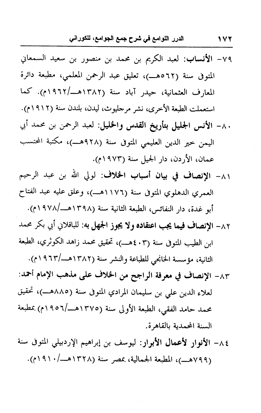 ٧٩ - الأنساب: لعبد الكريم بن محمد بن منصور بن سعيد السمعاني المتوفى سنة (٥٦٢ هـ)، تعليق عبد الرحمن المعلمي، مطبعة دائرة المعارف العثمانية، حيدر آباد سنة (١٣٨٢ هـ/ ١٩٦٢ م). كما استعملت الطبعة الأخرى، نشر مرجليوث، ليدن، بلندن سنة (١٩١٢ م).