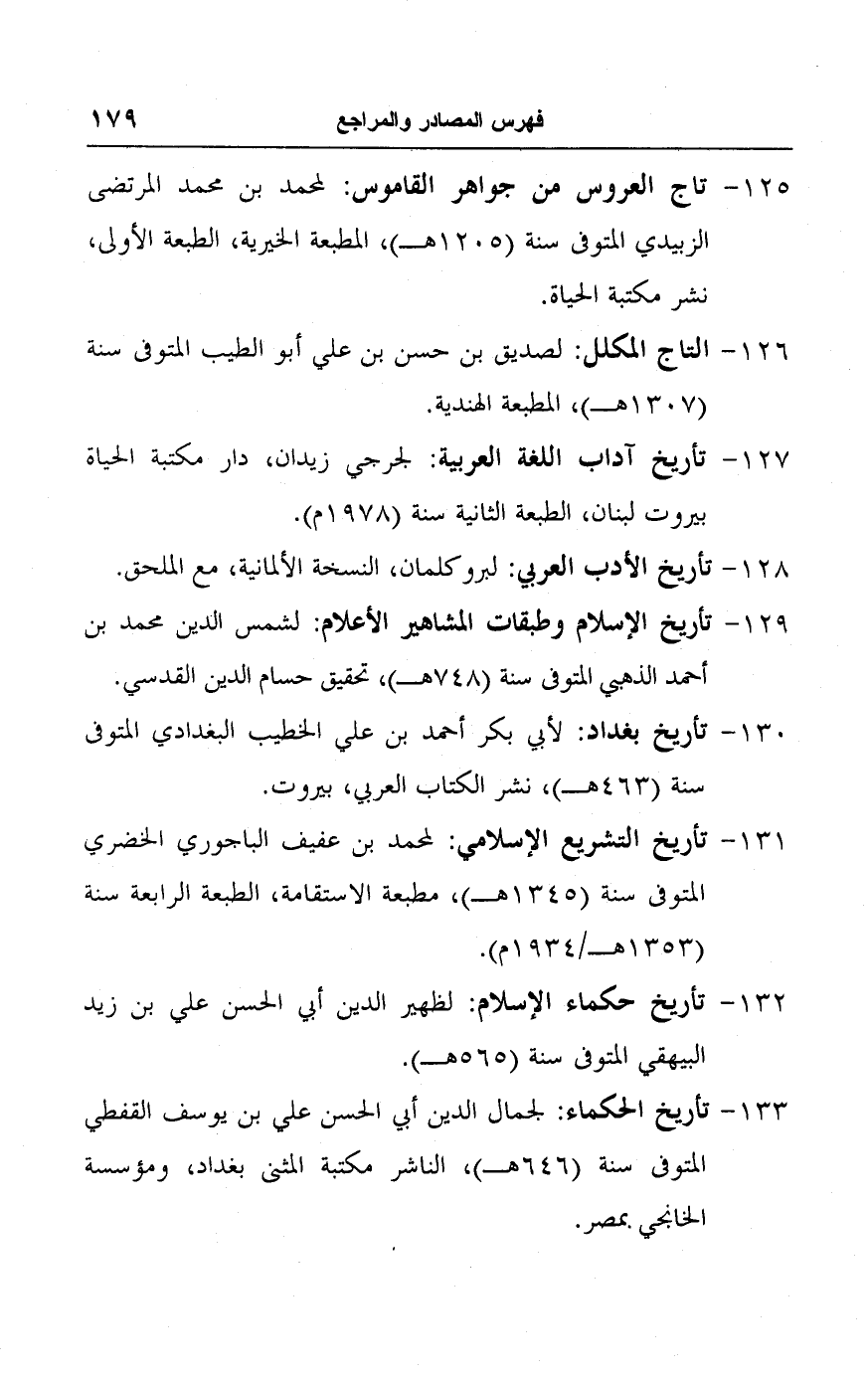 ١٢٥ - تاج العروس من جواهر القاموس: لمحمد بن محمد المرتضى الزبيدي المتوفى سنة (١٢٠٥ هـ)، المطبعة الخيرية، الطبعة الأولى، نشر مكتبة الحياة.