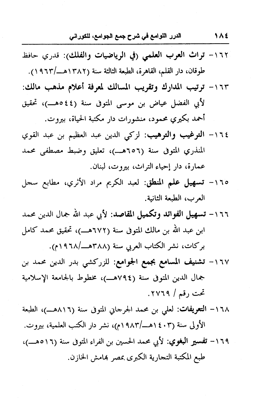 ١٦٢ - تراث العرب العلمي (في الرياضيات والفلك): قدري حافظ طوقان، دار القلم، القاهرة، الطبعة الثالثة سنة (١٣٨٢ هـ/ ١٩٦٣ م).
