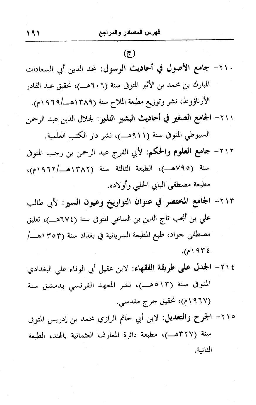 ٢١٠ - جامع الأصول في أحاديث الرسول: لمجد الدين أبي السعادات المبارك بن محمد بن الأثير المتوفى سنة (٦٥٦ هـ)، تحقيق عبد القادر الأرناؤوط، نشر وتوزيع مطبعة الملاح سنة (١٣٨٩ هـ/ ١٩٦٩ م).
