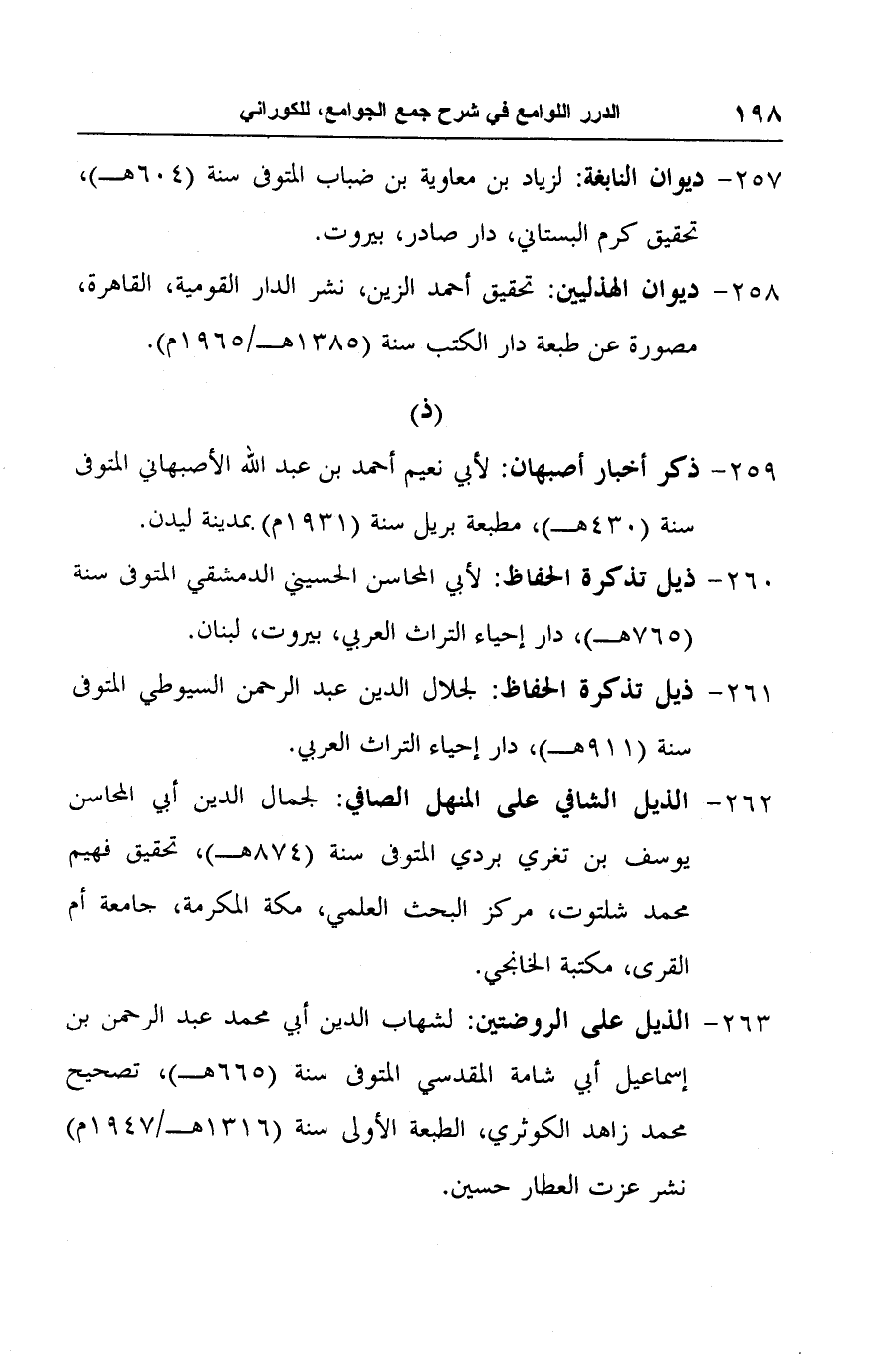 ٢٦٠ - ذيل تذكرة الحفاظ: لأبي المحاسن الحسيني الدمشقي المتوفى سنة (٧٦٥ هـ)، دار إحياء التراث العربي، بيروت، لبنان.