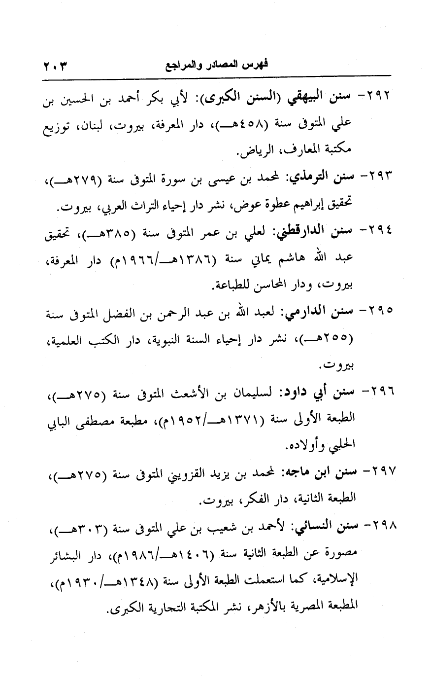 ٢٩٨ - سنن النسائي: لأحمد بن شعيب بن علي المتوفى سنة (٣٠٣ هـ)، مصورة عن الطبعة الثانية سنة (١٤٠٦ هـ/ ١٩٨٦ م)، دار البشائر الإسلامية، كما استعملت الطبعة الأولى سنة (١٣٤٨ هـ/ ١٩٣٠ م)، المطبعة المصرية بالأزهر، نشر المكتبة التجارية الكبرى.