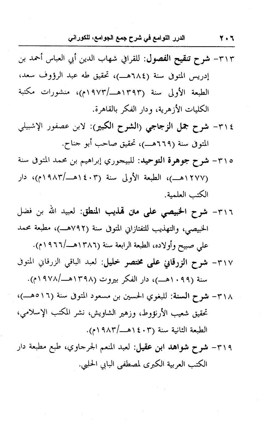 ٣١٣ - شرح تنقيح الفصول: للقرافي شهاب الدين أبي العباس أحمد بن إدريس المتوفى سنة (٦٨٤ هـ)، تحقيق طه عبد الرؤوف سعد، الطبعة الأولى سنة (١٣٩٣ هـ/ ١٩٧٣ م)، منشورات مكتبة الكليات الأزهرية، ودار الفكر بالقاهرة.