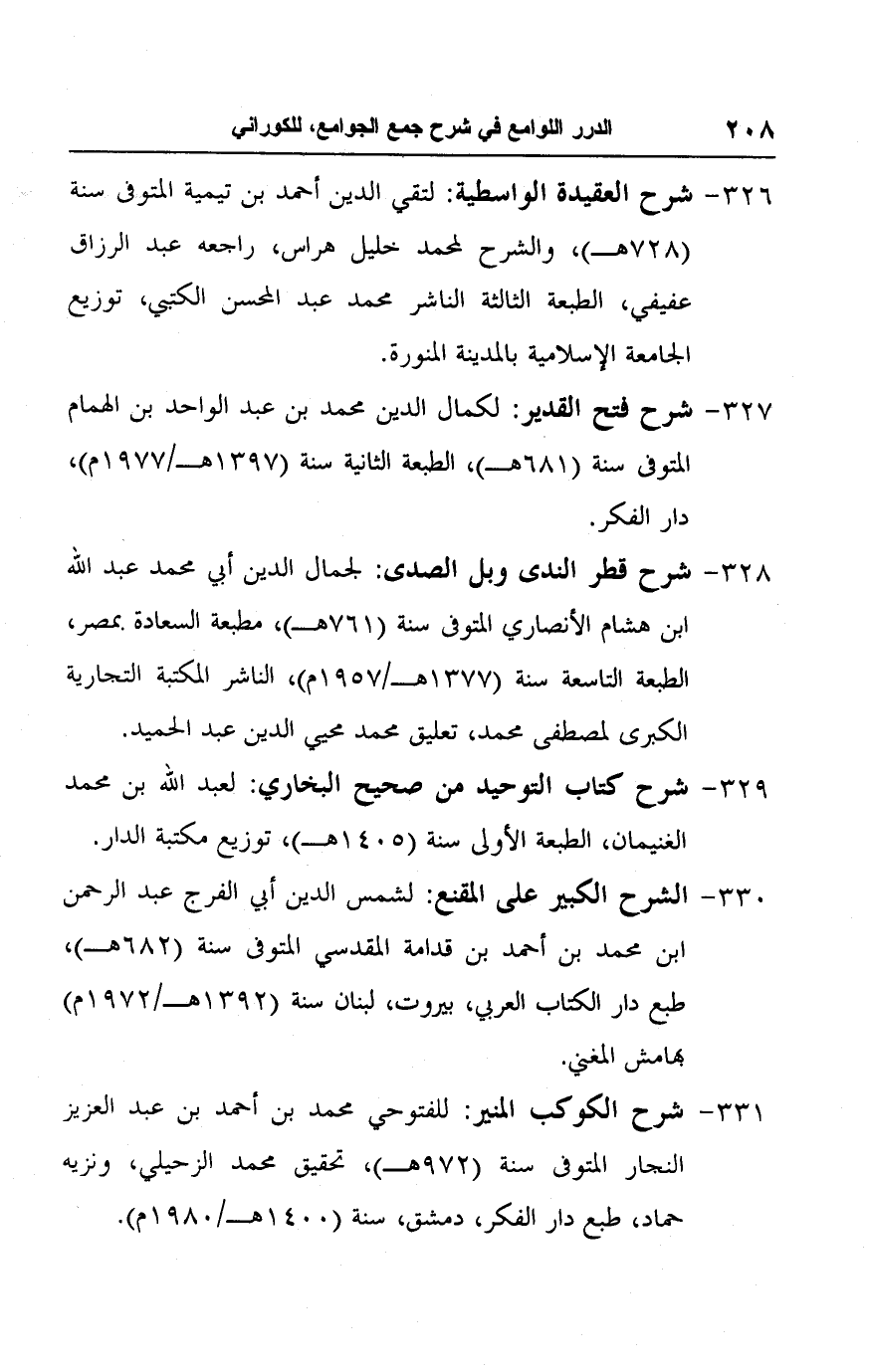 ٣٢٨ - شرح قطر الندى وبل الصدى: لجمال الدين أبي محمد عبد اللَّه ابن هشام الأنصاري المتوفى سنة (٧٦١ هـ)، مطبعة السعادة بمصر، الطبعة التاسعة سنة (١٣٧٧ هـ/ ١٩٥٧ م)، الناشر المكتبة التجارية الكبرى لمصطفى محمد، تعليق محمد محيي الدين عبد الحميد.