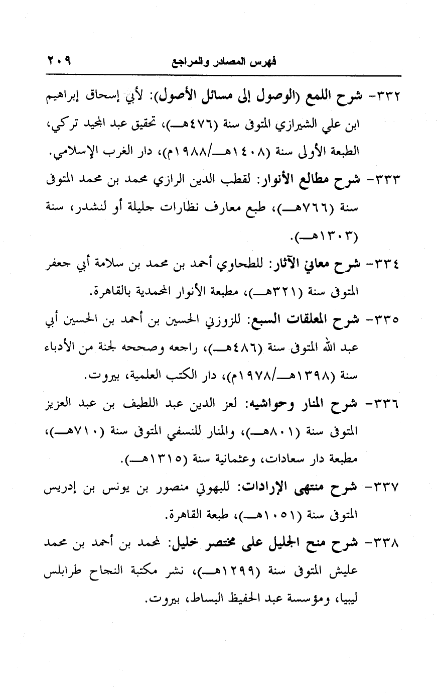 ٣٣٢ - شرح اللمع (الوصول إلى مسائل الأصول): لأبي إسحاق إبراهيم ابن علي الشيرازي المتوفى سنة (٤٧٦ هـ)، تحقيق عبد المجيد تركي، الطبعة الأولى سنة (١٤٠٨ هـ/ ١٩٨٨ م)، دار الغرب الإسلامي.