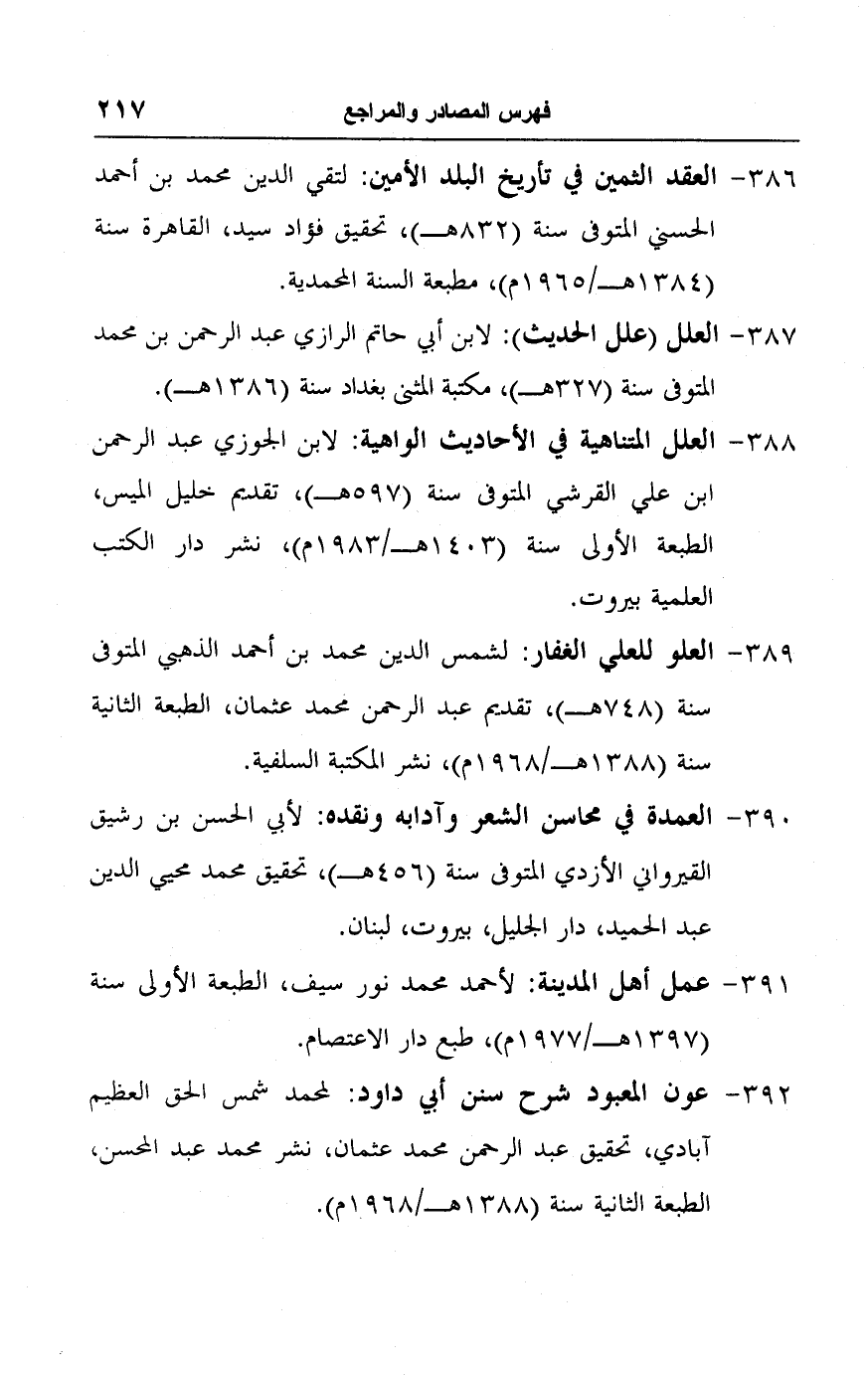 ٣٩٠ - العمدة في محاسن الشعر وآدابه ونقده: لأبي الحسن بن رشيق القيرواني الأزدي المتوفى سنة (٤٥٦ هـ)، تحقيق محمد محيي الدين عبد الحميد، دار الجليل، بيروت، لبنان.
