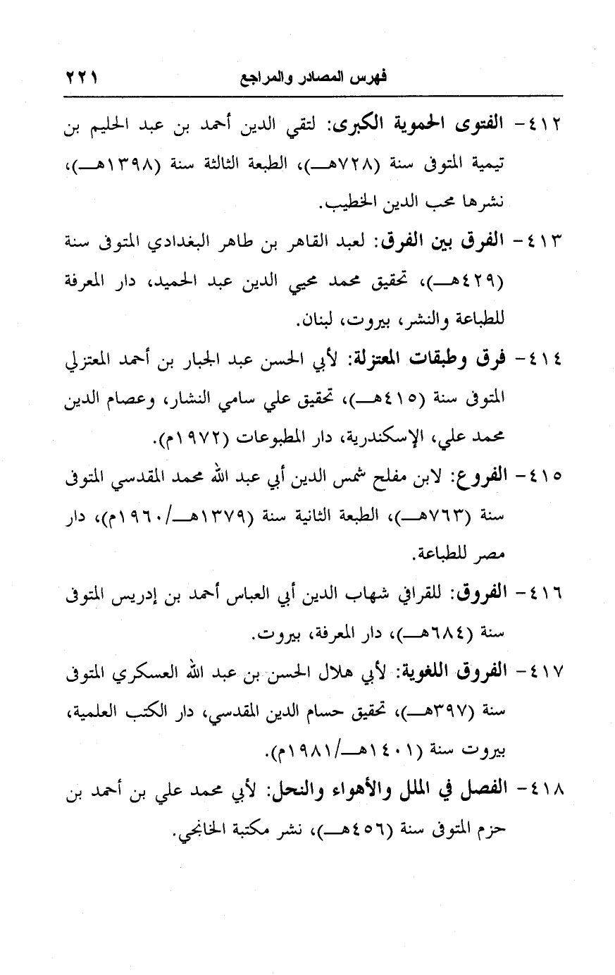 ٤١٣ - الفرق بين الفرق: لعبد القاهر بن طاهر البغدادي المتوفى سنة (٤٢٩ هـ)، تحقيق محمد محيي الدين عبد الحميد، دار المعرفة للطباعة والنشر، بيروت، لبنان.