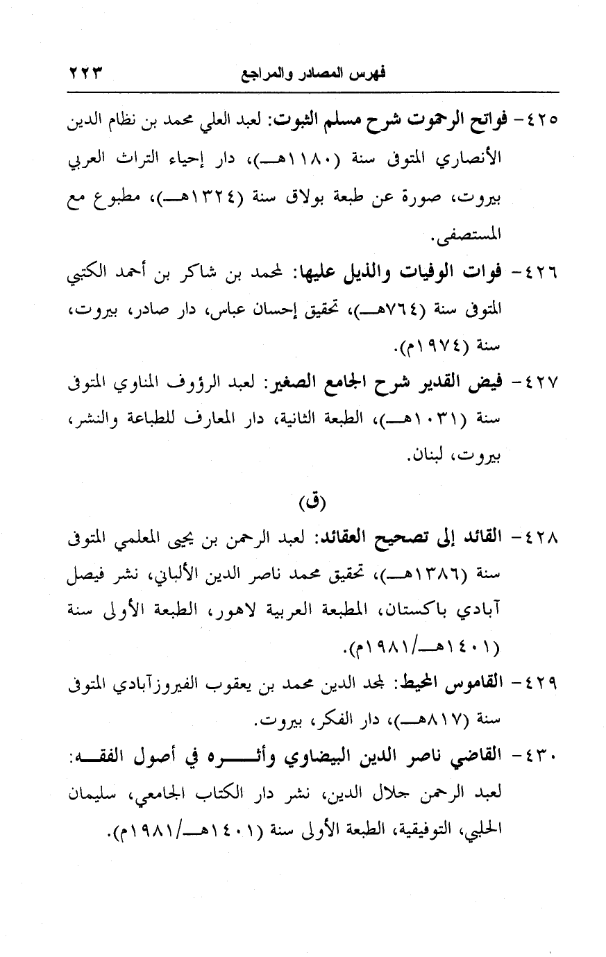 ٤٢٦ - فوات الوفيات والذيل عليها: لمحمد بن شاكر بن أحمد الكتبي المتوفى سنة (٧٦٤ هـ)، تحقيق إحسان عباس، دار صادر، بيروت، سنة (١٩٧٤ م).