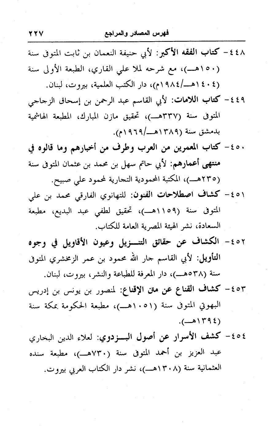 ٤٤٨ - كتاب الفقه الأكبر: لأبي حنيفة النعمان بن ثابت المتوفى سنة (١٥٠ هـ)، مع شرحه لملا علي القاري، الطبعة الأولى سنة (١٤٠٤ هـ/ ١٩٨٤ م)، دار الكتب العلمية، بيروت، لبنان.