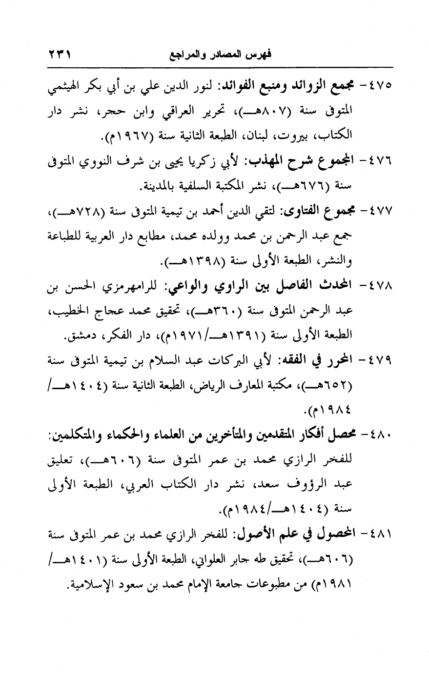 ٤٨١ - المحصول في علم الأصول: للفخر الرازي محمد بن عمر المتوفى سنة (٦٠٦ هـ)، تحقيق طه جابر العلواني، الطبعة الأولى سنة (١٤٠١ هـ/ ١٩٨١ م) من مطبوعات جامعة الإمام محمد بن سعود الإسلامية.