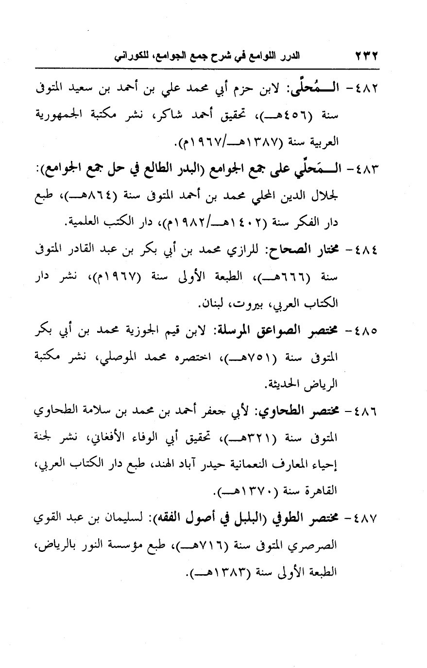 ٤٨٣ - المَحلِّي على جمع الجوامع (البدر الطالع في حل جمع الجوامع): لجلال الدين المحلي محمد بن أحمد المتوفى سنة (٨٦٤ هـ)، طبع دار الفكر سنة (١٤٠٢ هـ/ ١٩٨٢ م)، دار الكتب العلمية.