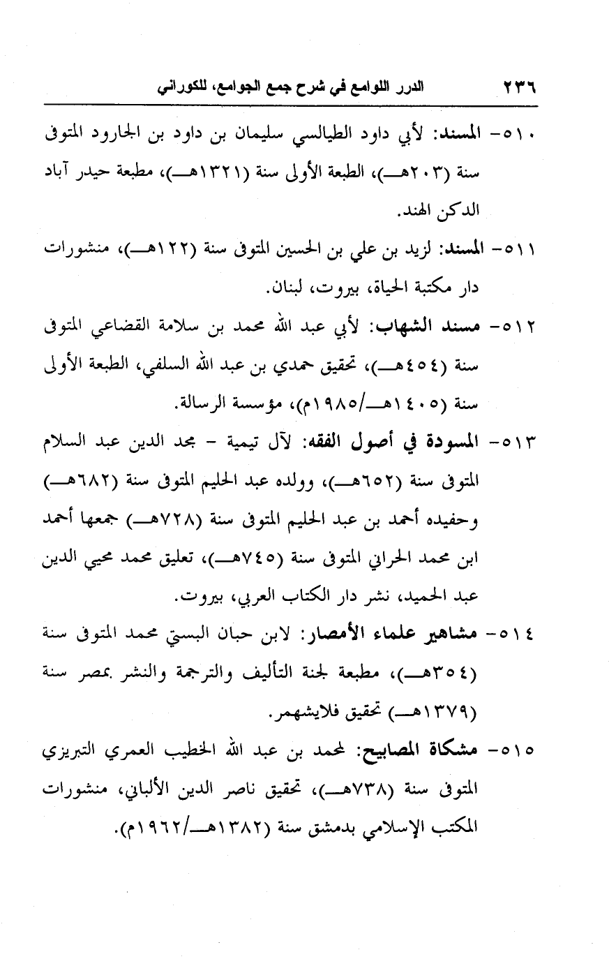 ٥١٠ - المسند: لأبي داود الطيالسي سليمان بن داود بن الجارود المتوفى سنة (٢٠٣ هـ)، الطبعة الأولى سنة (١٣٢١ هـ)، مطبعة حيدرآباد الدكن الهند.