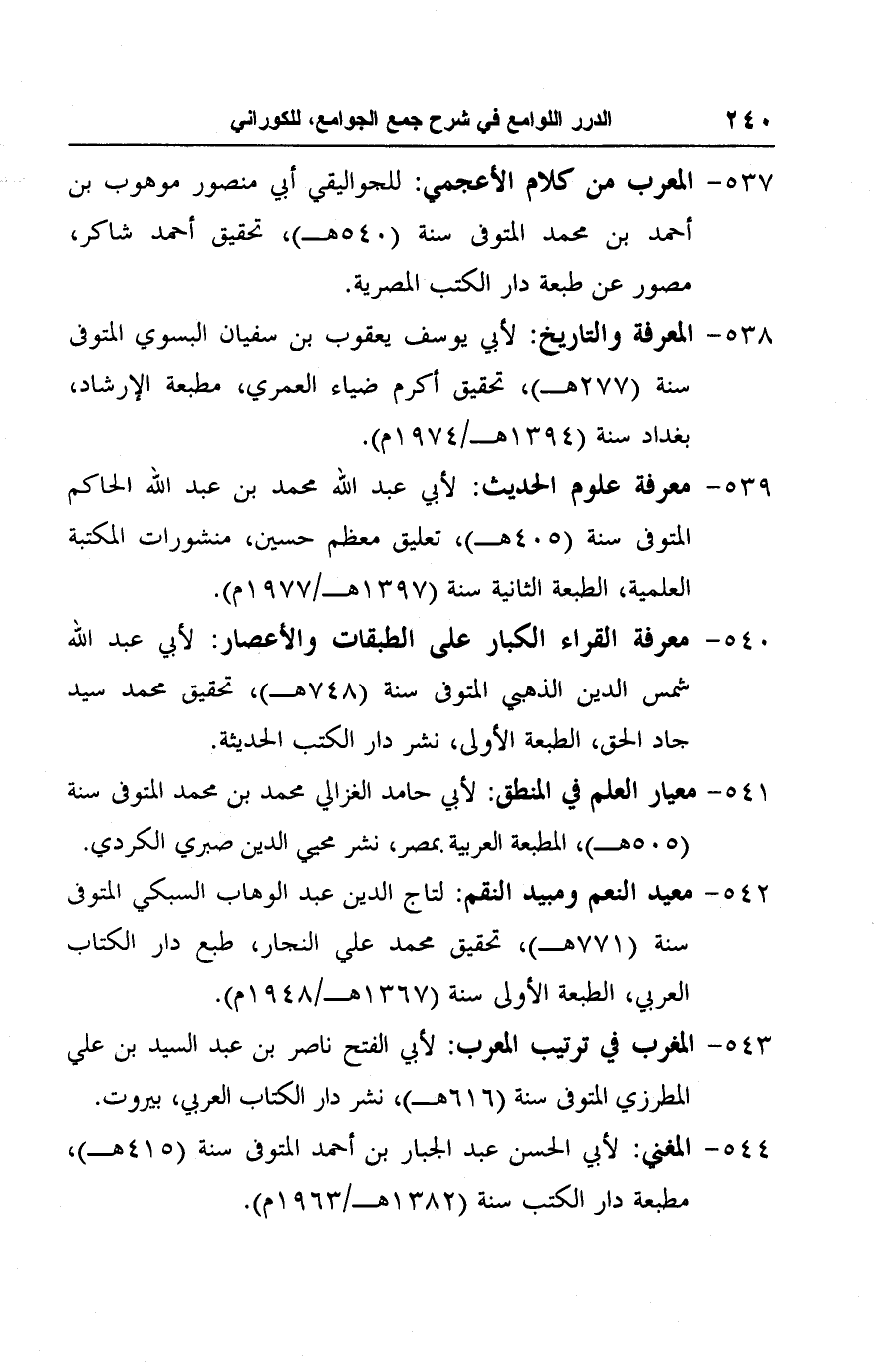 ٥٣٩ - معرفة علوم الحديث: لأبي عبد اللَّه محمد بن عبد اللَّه الحاكم المتوفى سنة (٤٠٥ هـ)، تعليق معظم حسين، منشورات المكتبة العلمية، الطبعة الثانية سنة (١٣٩٧ هـ/ ١٩٧٧ م).
