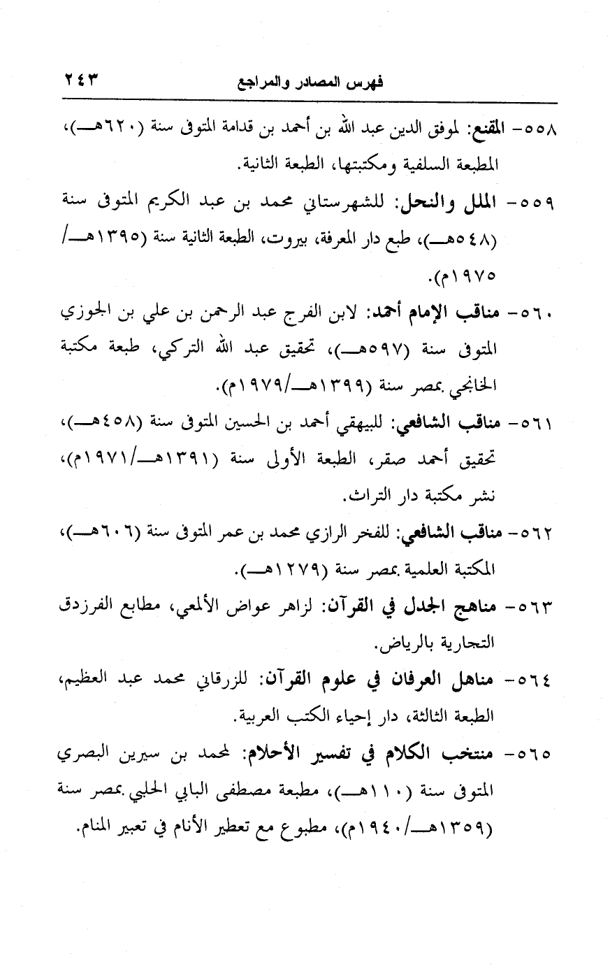 ٥٥٩ - الملل والنحل: للشهرستاني محمد بن عبد الكريم المتوفى سنة (٥٤٨ هـ)، طبع دار المعرفة، بيروت، الطبعة الثانية سنة (١٣٩٥ هـ/ ١٩٧٥ م).