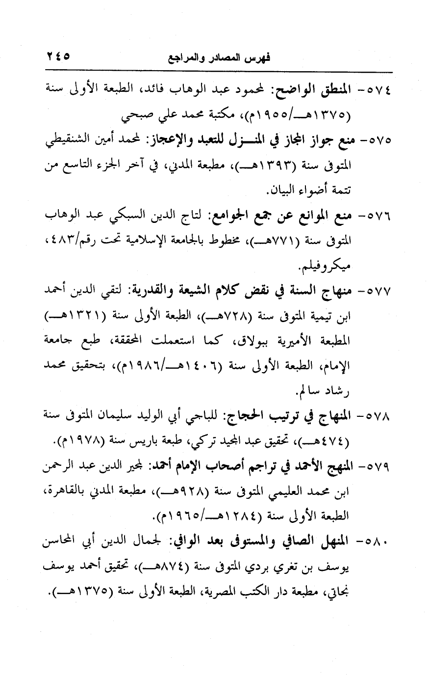 ٥٧٩ - المنهج الأحمد في تراجم أصحاب الإمام أحمد: لمجير الدين عبد الرحمن ابن محمد العليمي المتوفى سنة (٩٢٨ هـ)، مطبعة المدني بالقاهرة، الطبعة الأولى سنة (١٢٨٤ هـ/ ١٩٦٥ م).